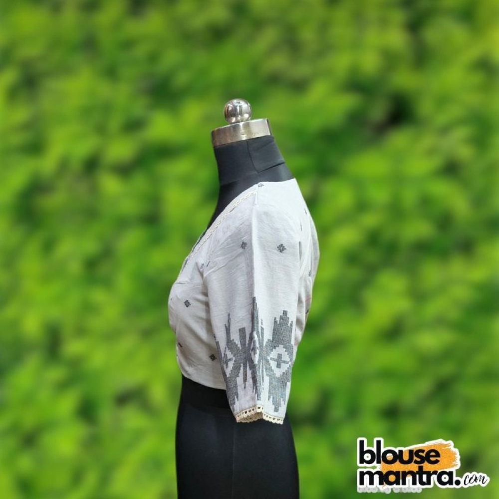 White Jamdani |V neck | Round Lace Attached Glass Sleeve