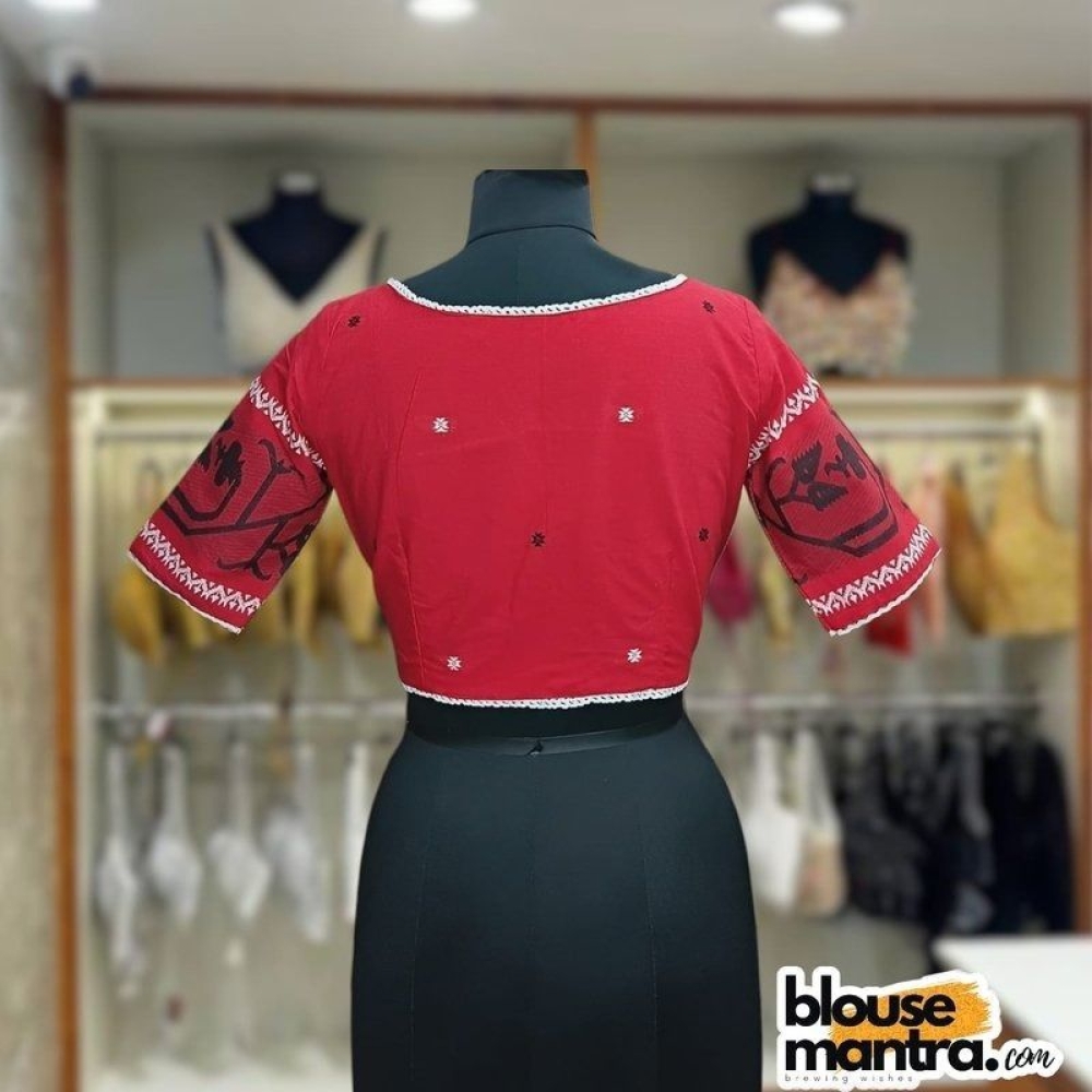 Red Jamdani | Thin lace all over The Blouse | Front Small V Cut Glass Sleeve