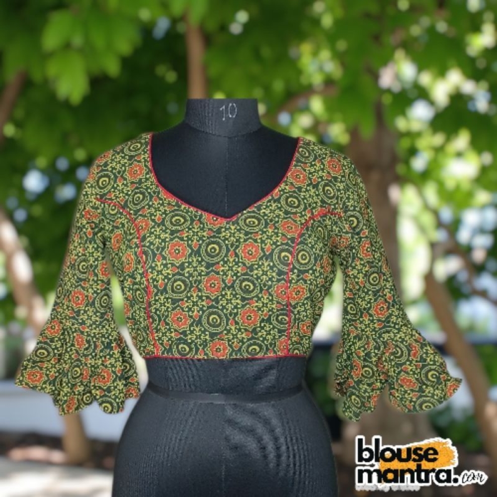 Green Ajrakh | | Red Piping | 3 cut On Back | Frill sleeves Quarter Sleeve