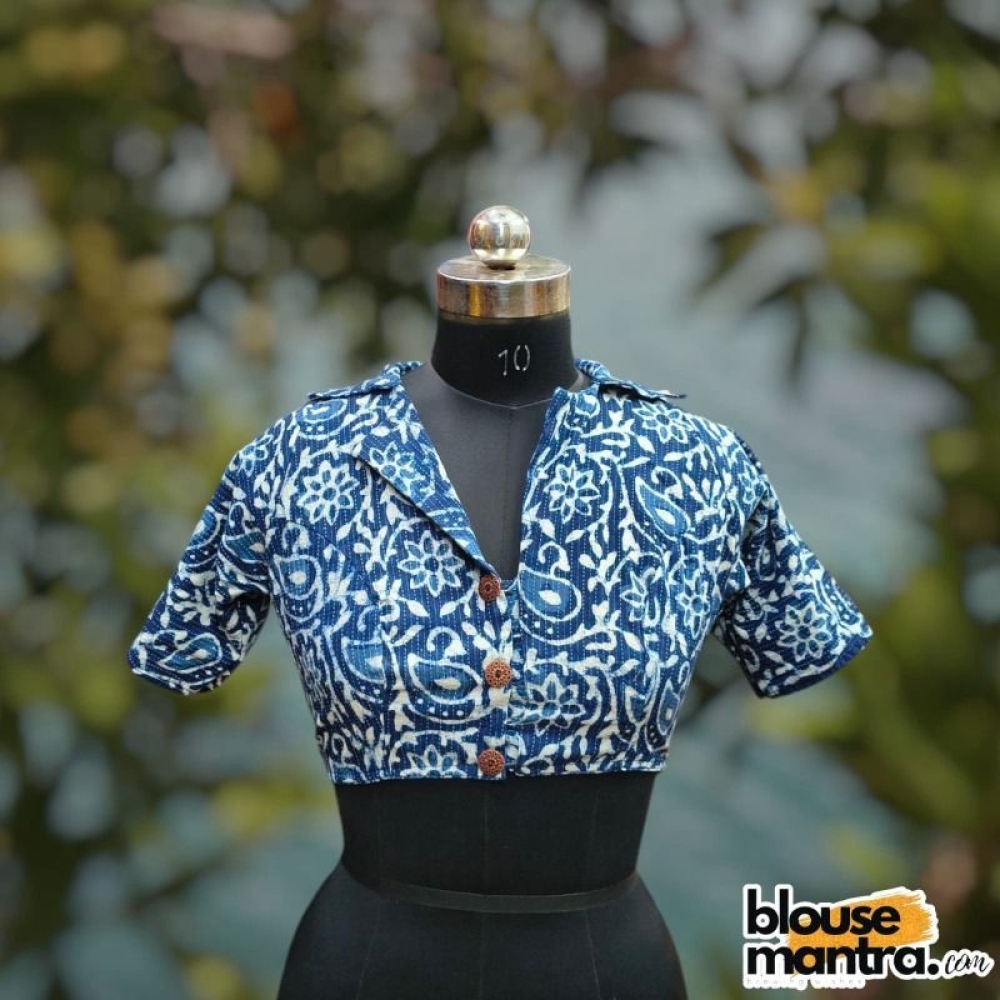 Indigo | kantha Stitch | Flower With Leaves Print | Blazer Coller |Wooden Button Glass Sleeve