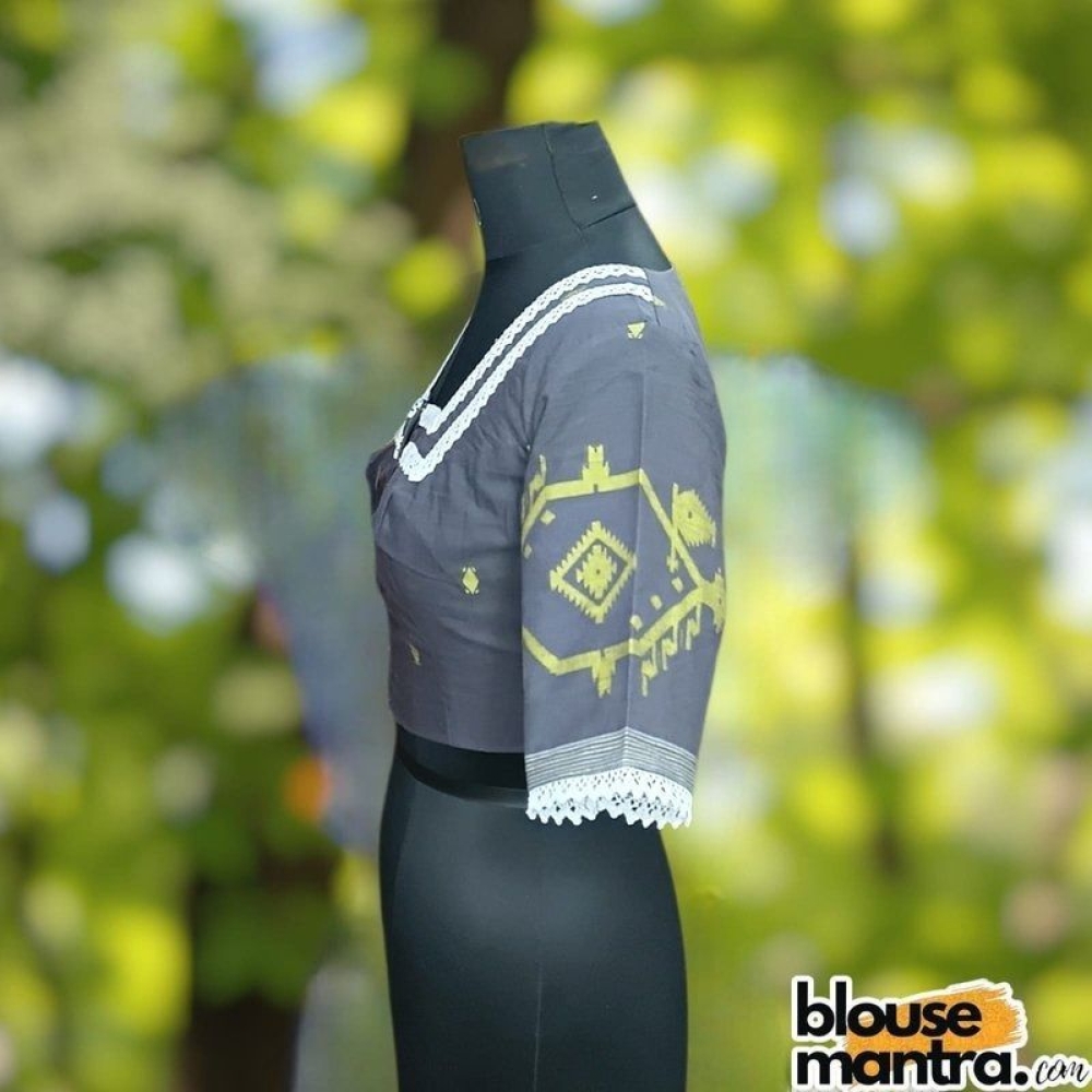 Dark Grey Jamdani | Yellow Weaving | Square Neck | Lace Attached Glass Sleeve